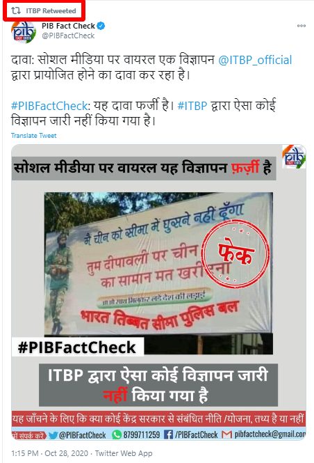 28 अक्टूबर 2020 को PIB फ़ैक्ट-चेक ने ट्वीट कर इस वायरल तस्वीर को फ़ेक बताया था. ट्वीट के मुताबिक, सोशल मीडिया पर भारत तिब्बत सीमा पुलिस बल की ओर से चीन का सामान न खरीदने को लेकर कोई विज्ञापन जारी नहीं किया गया है. ये तस्वीर फ़र्ज़ी है. PIB फ़ैक्ट-चेक के इस ट्वीट को ITBP के ऑफ़िशियल ट्विटर हैन्डल ने भी रीट्वीट किया.