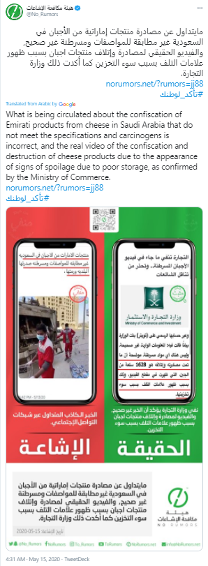 सऊदी अरब के मीडिया आउट्लेट Anti Rumor Authority (@NoRumors) ने 15 मई 2020 को इस वीडियो के बारे में ट्वीट किया है. ये मीडिया प्लेटफ़ॉर्म अफ़वाहों के बारे में खबर पब्लिश करता है ताकि समाज को कोई नुकसान न पहुंचे. इस ट्वीट के मुताबिक, मिनिस्ट्री ऑफ़ कॉमर्स ने इस बात की पुष्टि की है कि चीज़ में कोई भी कैंसरकारक पदार्थ नहीं था. @NoRumors ने इस वीडियो के बारे में एक आर्टिकल भी पब्लिश किया था.