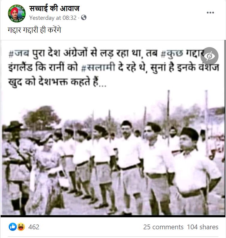 सोशल मीडिया पर एक ब्लैक एंड वाइट तस्वीर शेयर करते हुए दावा किया जा रहा है कि RSS स्वयंसेवकों ने ब्रिटेन की महारानी को सलामी दी थी. तस्वीर में RSS की पोशाक पहने कुछ लोग एक लाइन में खड़े दिख रहे हैं और ब्रिटेन की महारानी को उनके सामने से गुज़रते हुए देखा जा सकता है.