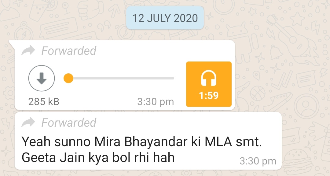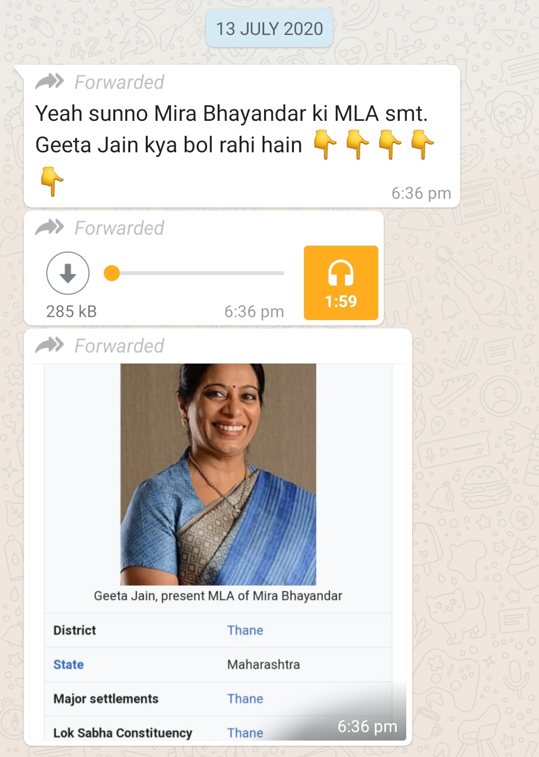 ऑडियो इस मेसेज के साथ शेयर हो रहा है – “ये सुनो मीरा भायंदर की MLA श्रीमती. गीता जैन क्या बोल रही है” ये क्लिप व्हाट्सऐप पर काफ़ी शेयर हो रही है. इसके अलावा, इसे गीता जैन की तस्वीर के साथ भी शेयर किया जा रहा है.
