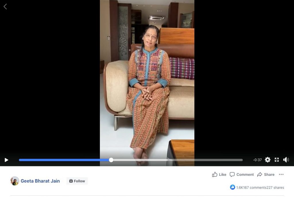 11 जुलाई को फ़ेसबुक पर गीता जैन ने इस बारे में एक वीडियो भी शेयर किया है. वीडियो में वो बताती है कि उनके नाम से वायरल हो रहा ऑडियो क्लिप फ़र्ज़ी है. वीडियो में गीता जैन लोगों से सरकार द्वारा दिए जा रहे सभी दिशा-निर्देशों का पालन करने को कहती हैं.