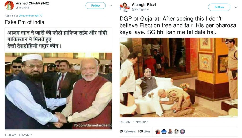 ये दोनों तस्वीरें कांग्रेस से जुड़े लोगो ने ट्विटर पर पोस्ट की। जहाँ आलमगीर रिजवी ने अपने आप को ‘फ्रेंड्स ऑफ़ कांग्रेस‘ वेबसाइट पर NRI टीम के सोशल मीडिया वालंटियर के रूप में सूचीबद्ध किया है, वही अरशद चिश्ती के ट्विटर बायोग्राफी पर उनके कांग्रेस के IT सेल के सदस्य होने की बात है। आलमगीर रिज़वी को कई बार उनके तस्वीर के नकली होने की बात बताये जाने पर भी उन्होंने यह तस्वीर नहीं हटाई। अंत में कांग्रेस प्रवक्ता संजय झा ने तस्वीर को रीट्वीट करते हुए कहा की, “अगर ये सच है, तो वाकई बहुत ही अतिशय है। दंग कर देने वाली यह तस्वीर समझ के परे है। (अनुवाद)”