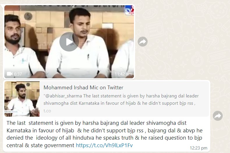 इसके अलावा हमने सरफ़राज़ से बात की. उन्होंने कहा कि पिछले 3 दिन से ये वीडियो शेयर किया जा रहा है. उन्होंने पुलिस को भी इस बारे में सूचित किया है. उन्होंने कहा कि कर्नाटक में चल रहे हिजाब विवाद को लेकर CFI ने 8 फ़रवरी को प्रेस कॉन्फ्रेंस रखी थी. उसी समय का ये वीडियो है. और सोशल मीडिया पर किया जा रहा दावा ग़लत है. वीडियो में हर्षा नहीं है.