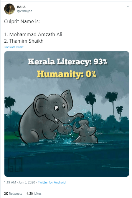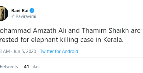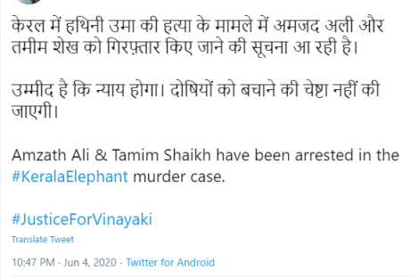 केरल के पलक्कड़ में एक गर्भवती हथिनी ने विस्फोटक से भरा अनानास खा लिया था. विस्फोटक के मुंह में ही फट जाने के कारण हथिनी का जबड़ा टूट गया और आखिर में उसने दम तोड़ दिया. केरला की इस दिल को दहला देने वाली घटना को कुछ सोशल मीडिया यूज़र्स ने सांप्रदायिक रंग देना शुरू कर दिया. कुछ यूज़र्स दावा करने लगे कि इस मामले में गिरफ़्तार किये गए लोगों का नाम अमजद अली और थमिम शेख है. इस दावे को शुरुआती दौर में शेयर करने वाले लोगों में स्वास्थ्य और परिवार कल्याण मंत्रालय के केन्द्रीय मंत्री के मीडिया सलाहकार अमर प्रसाद रेड्डी शामिल शामिल हैं. रेड्डी ने अपना ट्वीट बाद में डिलीट कर दिया लेकिन इससे पहले उनके ट्वीट को हज़ारों बार लाइक और रीट्वीट किया जा चुका था. (ट्वीट का आर्काइव लिंक) बाद में उन्होंने इस मामले में सफ़ाई भी दी.