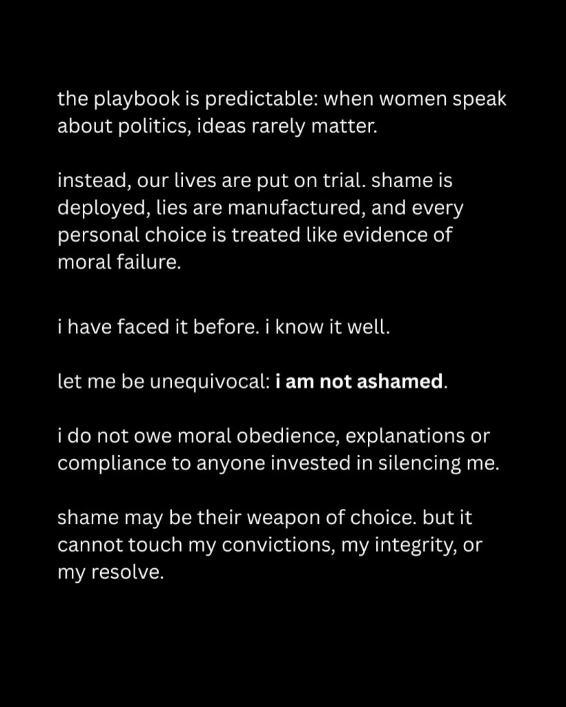 दूसरे स्लाइड में वो लिखती हैं, “जब महिलाएं पॉलिटिक्स या आइडियाज पर बोलती हैं तो उनकी बातों पर चर्चा नहीं होती बल्कि इसके बजाय, हमारी ज़िंदगी को कठघरे में खड़ा कर दिया जाता है. शर्मिंदा किया जाता है, झूठ गढ़े जाते हैं, और हर पर्सनल चॉइस को नैतिक नाकामी के सबूत की तरह देखा जाता है. मैंने इसका सामना पहले भी किया है और मैं साफ-साफ कहना चाहती हूँ मुझे कोई शर्म नहीं है. जो लोग मुझे चुप कराना चाहते हैं, मैं उन्हें नैतिक आज्ञा मानने, सफाई देने या उनकी बात मानने के लिए बाध्य नहीं हूँ.”