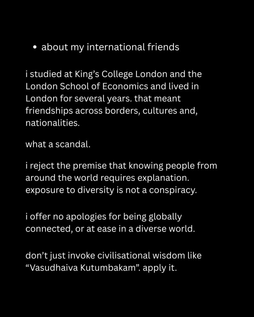 यशस्विनी अपने इंटरनेशनल दोस्तों के बारे में लिखती है, “मैंने किंग्ज़ कॉलेज लंदन और लंदन स्कूल ऑफ़ इकोनॉमिक्स में पढ़ाई की और कई सालों तक लंदन में रही. जिसका मतलब है, अलग अलग सीमाओं, संस्कृतियों और राष्ट्रीयताओं वाले लोगों से दोस्ती का होना. विविधता के संपर्क में आना कोई साज़िश नहीं है और मैं दुनिया भर से जुड़े होने या विविध दुनिया में सहज होने के लिए कोई माफ़ी नहीं माँगती.” उन्होंने ट्रोल करने वालों के लिए लिखा, “सिर्फ़ “वसुधैव कुटुंबकम” जैसी सभ्यता का ज़िक्र न करें, इसे लागू भी करें.”