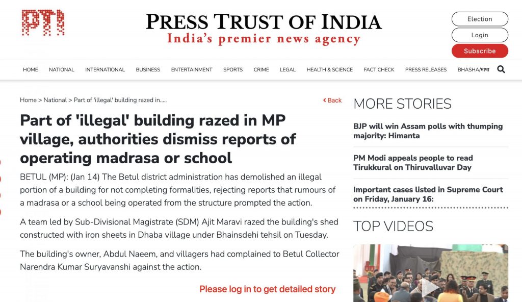 प्रेस ट्रस्ट ऑफ इंडिया (PTI) के हवाले से बेतूल ज़िला प्रशासन ने बताया कि औपचारिकताओं का पालन न करने के कारण एक इमारत के अवैध हिस्से को ध्वस्त कर दिया है साथ ही प्रशासन ने उन खबरों को खारिज कर दिया है जिनमें कहा गया था कि इमारत में मदरसा या स्कूल चलने की अफवाहों के कारण यह कार्रवाई की गई. उप-मंडल मजिस्ट्रेट (एसडीएम) अजीत मरावी के नेतृत्व में एक टीम ने मंगलवार को भैंसदेही तहसील के धाबा गांव में लोहे की चादरों से बने भवन के शेड को ध्वस्त किया.