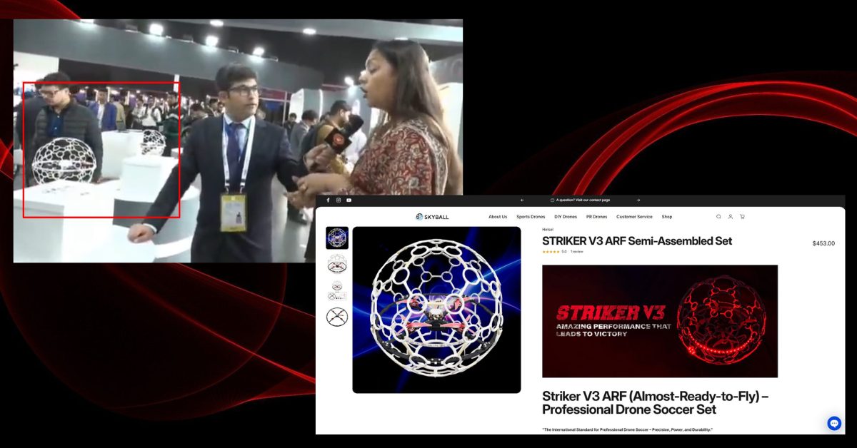 हालांकि, मॉडल पर रिवर्स इमेज सर्च से हमें दक्षिण कोरिया के हेलसेल ग्रुप की वेबसाइट मिली जो ड्रोन स्पोर्ट्स में माहिर है. विशिष्ट मॉडल, जैसा कि गलगोटियास यूनिवर्सिटी के प्रतिनिधि द्वारा प्रदर्शित किया गया है, “स्ट्राइकर वी3 ARF सेमी-असेंबल” सेट से काफी मिलता-जुलता है. आगे, तुलना देखें: