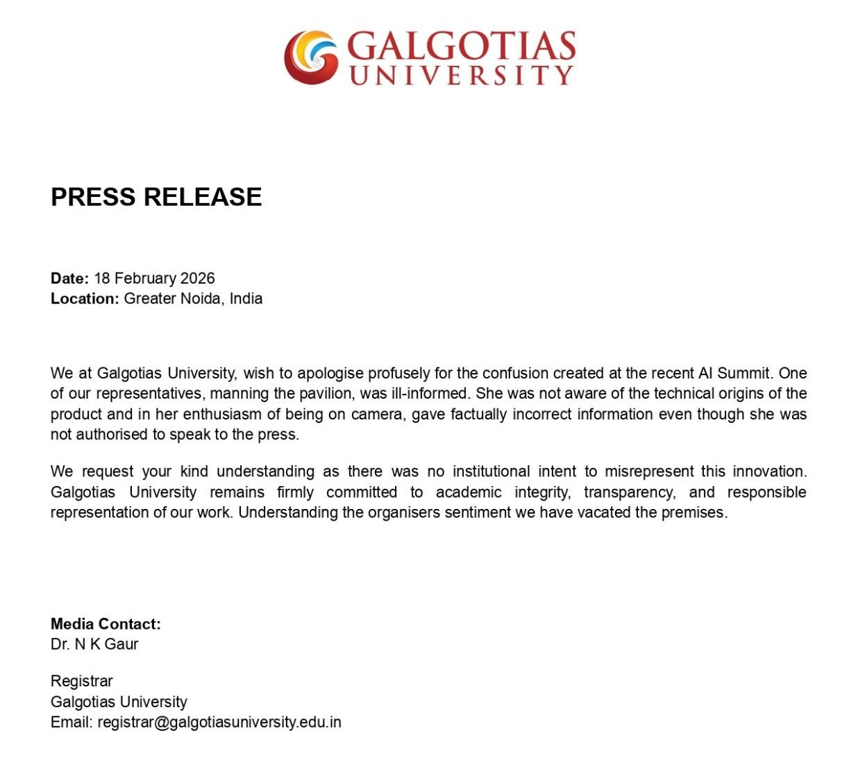 CPI (M) सांसद जॉन ब्रिटास ने एक X पोस्ट में कहा, “गलगोटिया यूनिवर्सिटी को प्रमुख भाजपा नेताओं का संरक्षण और समर्थन प्राप्त है जिसमें डॉ. संबित पात्रा से लेकर केंद्रीय मंत्री पीयूष गोयल तक अलग-अलग यूनिवर्सिटी कार्यक्रमों में शामिल हुए हैं. ये कोई आश्चर्य की बात नहीं है कि संस्थान अक्सर “विक्सित भारत” नारे पर जोर देता है. ये घनिष्ठ संबंध तब स्पष्ट हुआ जब यूनिवर्सिटी ने AI शिखर सम्मेलन में “ओरियन” के रूप में ब्रांडेड एक घरेलू आविष्कार के रूप में व्यावसायिक रूप से मौजूद चीनी रोबोट कुत्ते को प्रदर्शित किया जिसे आईटी मंत्री के अलावा किसी और ने ट्वीट में प्रचारित नहीं किया था.”