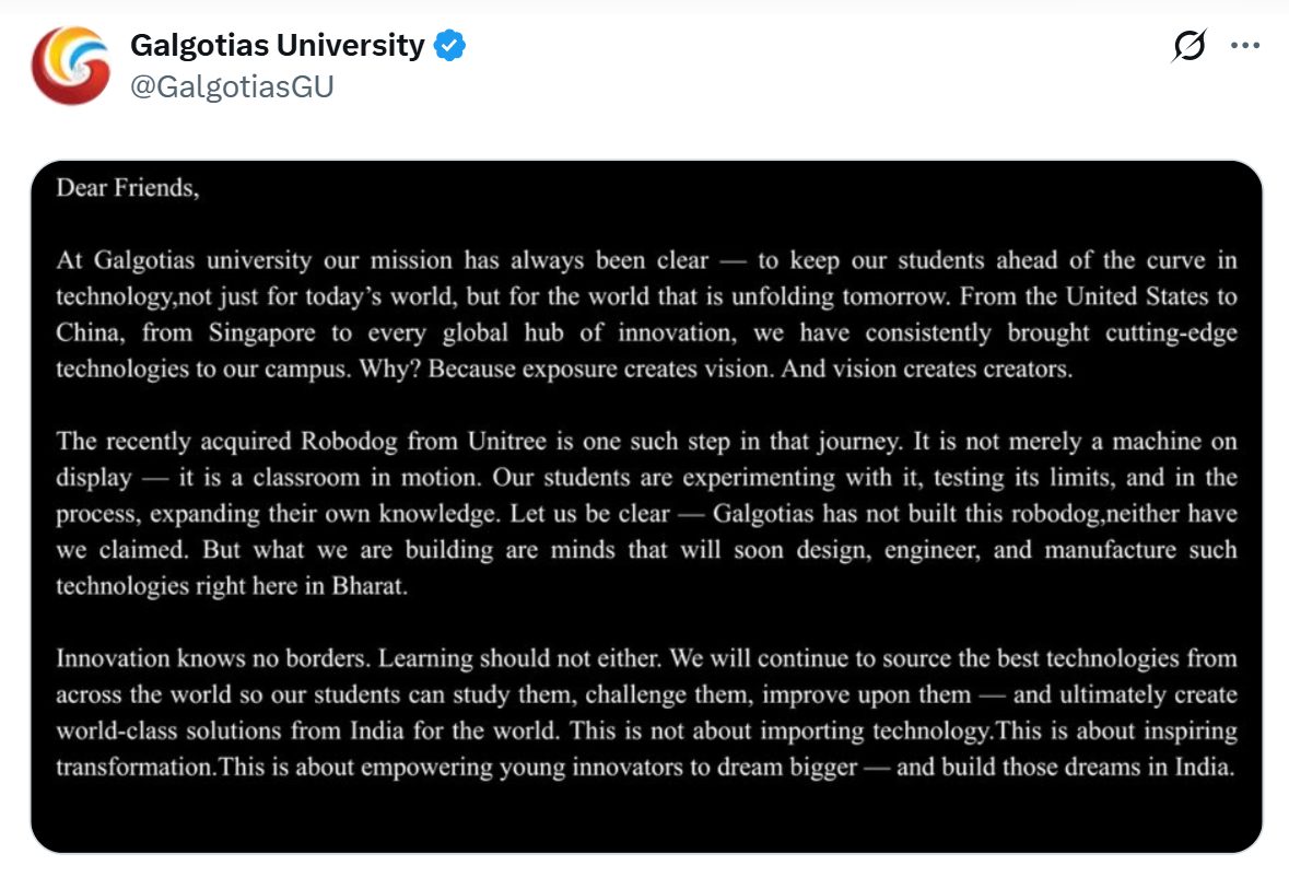ग्रेटर नोएडा स्थित निजी यूनिवर्सिटी ने ये कहकर अपना बचाव करने की कोशिश की कि उसने कभी ये दावा नहीं किया कि रोबोडॉग उनके द्वारा बनाया गया था. यूनिवर्सिटी ने सोशल मीडिया पर बयान शेयर किया.
