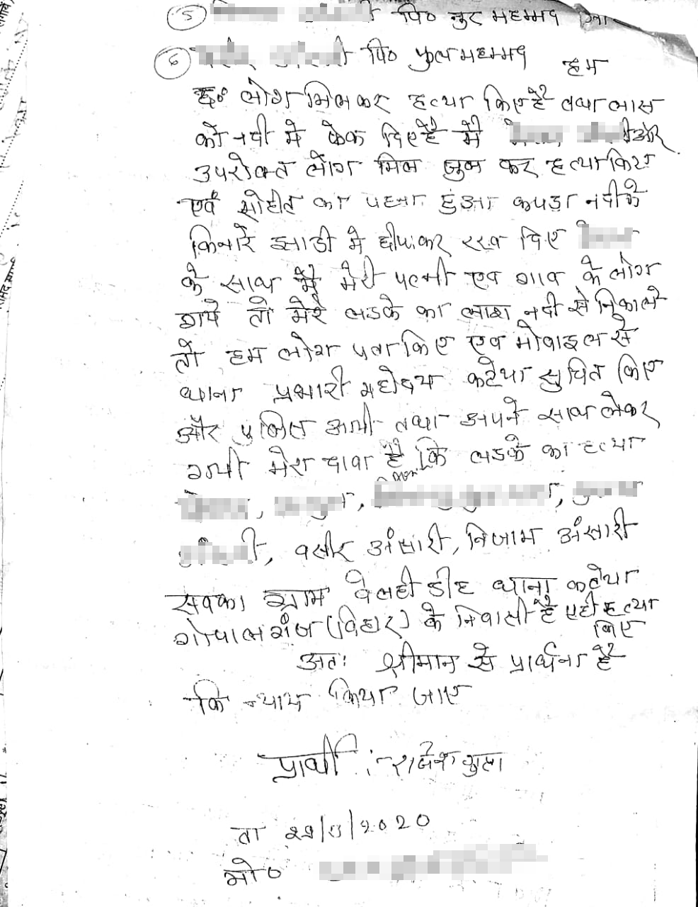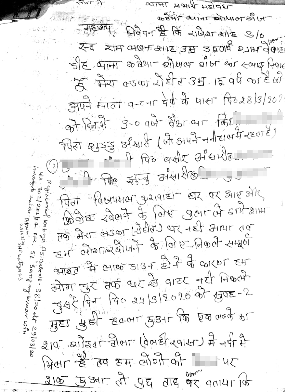 अब बात उस FIR की जो कि मौत के अगले दिन दर्ज करवाई गयी थी. इसे रोहित के पिता राजेश जायसवाल ने दर्ज करवाया था. इस FIR में आपको कहीं भी मस्जिद का ज़िक्र देखने को नहीं मिलेगा. 2 पन्नों की FIR में पीड़ित पिता ने जो लिखा उसके अनुसार मामला कुछ यूं था – कुछ बच्चे रोहित को खेलने के लिए घर से बुलाकर ले गए. इन लड़कों में 3 मुस्लिम थे और 1 हिन्दू. शाम को रोहित वापस घर नहीं आया और अगली सुबह रोहित के परिवार को मालूम पड़ा कि एक लड़के का शव नदी में मिला है. रोहित के परिवार को एक लड़के पर शक़ हुआ. जब उससे पूछताछ की तो उसने कहा कि 6 लोगों ने मिलकर रोहित की ह्त्या की है और जिसके बाद लाश को नदी में फेंक दिया गया. सभी ने मिलकर रोहित की हत्या की और उसके कपड़े नदी के किनारे झाड़ी में छुपा दिए. रोहित के पिता ने FIR में अपने बेटे की हत्या के लिए 6 लोगों पर आरोप लगाया. इनमें एक हिन्दू है और बाकी के मुसलमान हैं. इन सभी में चार नाबालिग हैं, इसीलिए हम उनका नाम उजागर नहीं कर सकते. FIR की कॉपी में भी उनके नाम को ब्लर कर दिया है.