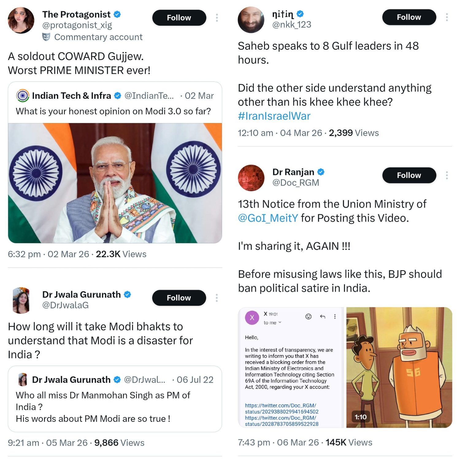 राजनीतिक राय व्यक्त करने वाले अन्य यूजर्स को भी कड़े प्रतिबंधों का सामना करना पड़ रहा है. The Protagonist नाम के यूजर ने ‘मोदी 3.0’ के बारे में अपनी तीखी राय व्यक्त की. इस पोस्ट को तत्काल सरकारी आदेश पर भारत में ब्लॉक कर दिया गया.