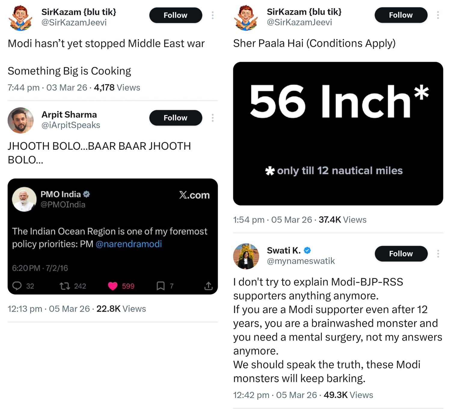 ‘सर काज़म’ नाम के यूज़र ने मिडल ईस्ट युद्ध पर प्रधानमंत्री की भूमिका को लेकर हल्का-फुल्का मज़ाक किया और लिखा, “मोदी ने अबतक मिडल ईस्ट के युद्ध को नहीं रोका है, लगता है कुछ बड़ा पक रहा है.” इसके अलावा, एक दूसरे ट्वीट में यूजर ने प्रधानमंत्री के ’56 इंच के सीने’ वाले प्रसिद्ध बयान का मज़ाक उड़ाते हुए लिखा था, “यह दावा केवल 12 समुद्री मील तक लागू होता है.” उनके दोनों पोस्ट्स ब्लॉक कर दिए गए.
