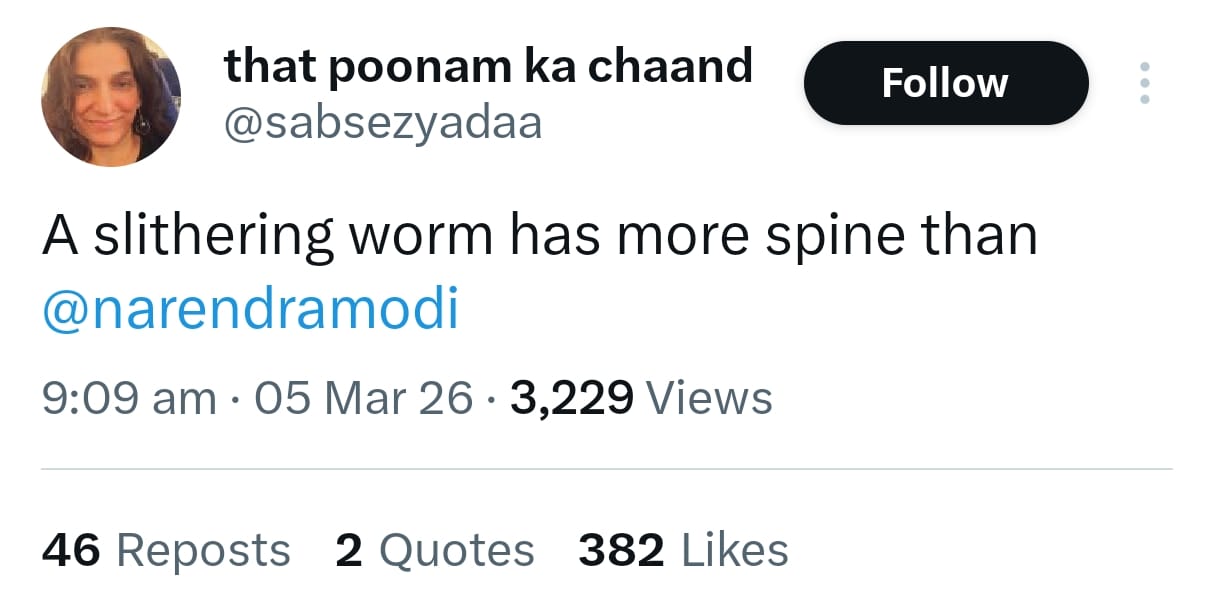 पूनम नाम की यूजर ने 5 मार्च को एक पोस्ट में लिखा था, “एक रेंगने वाले कीड़े में नरेंद्र मोदी से ज़्यादा रीढ़ होती है.” सरकार ने उनके इस ट्वीट को सूचना प्रौद्योगिकी अधिनियम, 2000 (आईटी एक्ट) की धारा 69A का हवाला देते हुए सोशल मीडिया प्लेटफॉर्म्स एक्स पर भारत में ब्लॉक करने का आदेश दे दिया.