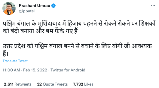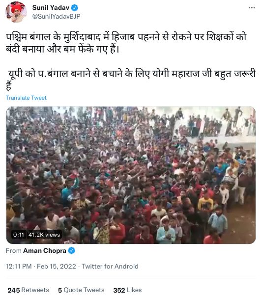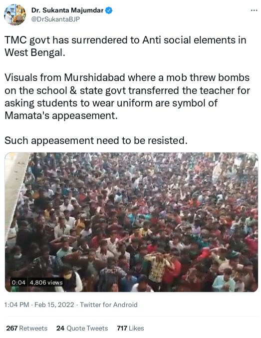 पश्चिम बंगाल के बीजेपी विधायक सुकांत मजूमदार, बीजेपी दिल्ली वीपी सुनील यादव और बीजेपी यूपी के प्रवक्ता प्रशांत पटेल उमराव ने दावा किया कि मुर्शिदाबाद में जिस स्कूल में छात्राओं को हिजाब पहनकर परिसर में प्रवेश करने पर रोक लगाई गई थी वहां प्रदर्शनकारियों ने बम फेंके.
