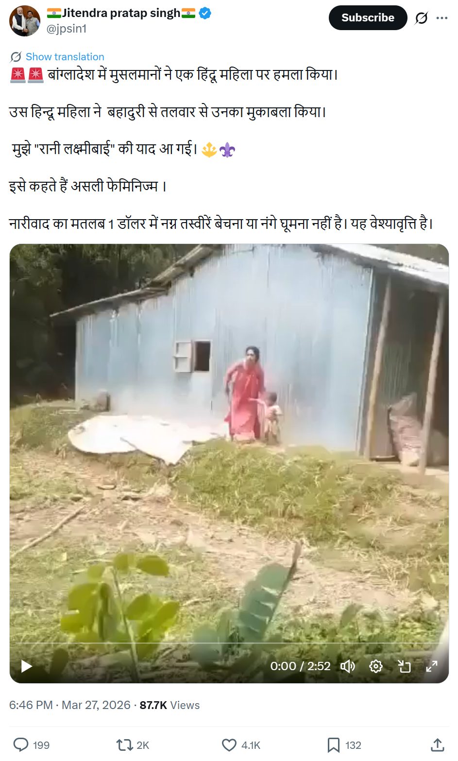 अक्सर गलत जानकारी सांप्रदायिक एंगल के साथ शेयर करने वाले भाजपा समर्थक जितेंद्र प्रताप सिंह ने इस वीडियो को शेयर करते हुए दावा किया कि बांग्लादेश में, मुसलमानों ने एक हिंदू महिला पर हमला किया. उस हिंदू महिला ने तलवार से बहादुरी के साथ उनका मुकाबला किया. (आर्काइव लिंक)