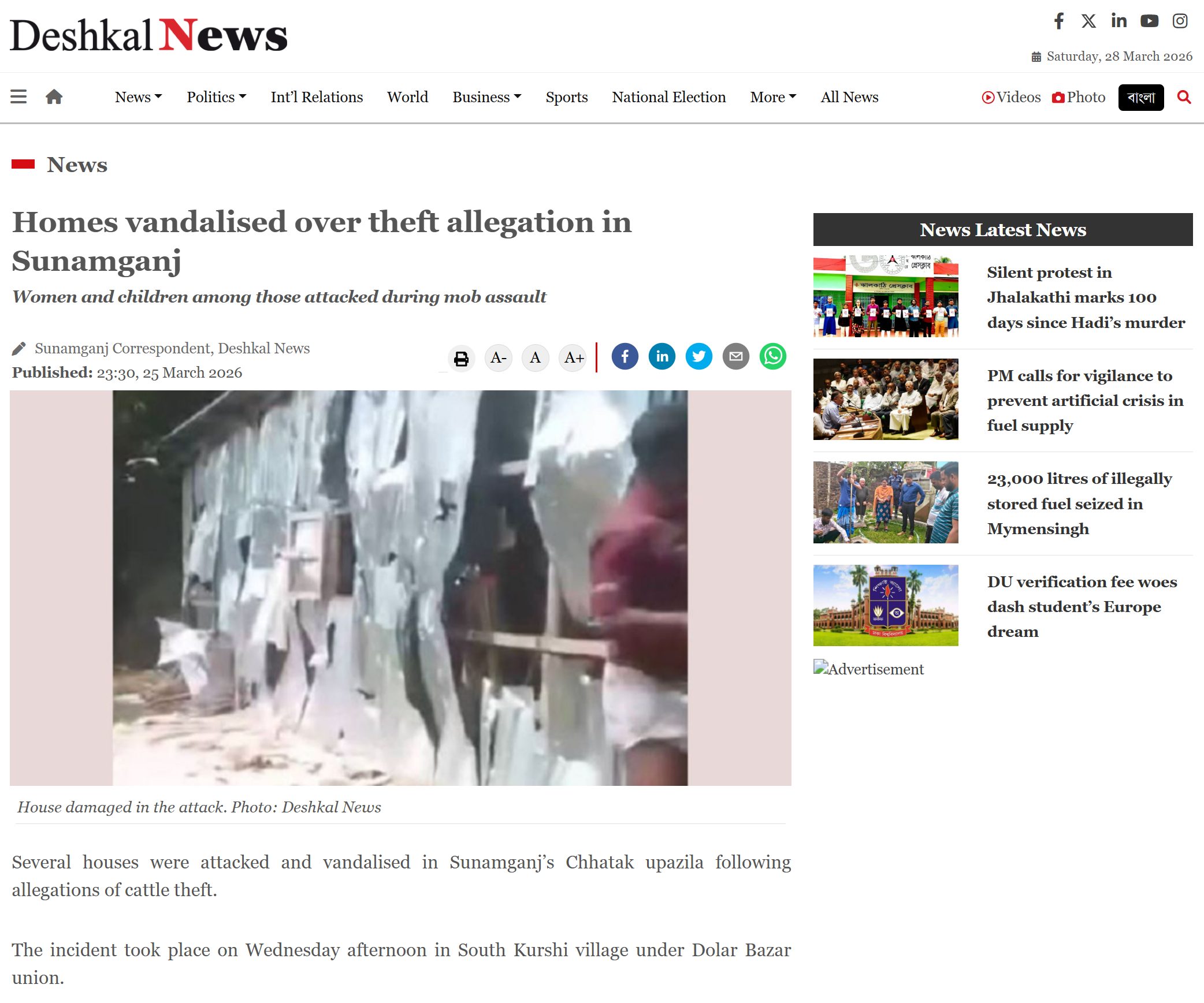वायरल वीडियो के की-फ्रेम्स को रिवर्स इमेज सर्च करने पर हमें बांग्लादेशी न्यूज़ वेबसाइट ‘देशकाल न्यूज‘ द्वारा 25 मार्च को पब्लिश्ड एक रिपोर्ट मिली. इस रिपोर्ट के अनुसार, ये पूरी घटना चोरी के आरोपों से जुड़ी है. बांग्लादेश के सुनामगंज ज़िले के छताक उपजिला में मवेशी चोरी के आरोप में एक उत्तेजित भीड़ ने कई घरों पर हमला कर तोड़फोड़ की. यह घटना दक्षिण कुर्शी गांव में हुई, जहां चोरी की बार-बार हो रही घटनाओं से नाराज़ लगभग सौ से अधिक लोगों ने आरोपी तारेक मिया और अली हुसैन के घरों को निशाना बनाया. इस हिंसक हमले के दौरान न केवल घरों और घरेलू सामान को नुकसान पहुँचाया गया, बल्कि घर में मौजूद महिलाओं और बच्चों के साथ भी मारपीट की गई. स्थानीय लोगों का दावा है कि आरोपियों को पहले भी ग्राम परिषद द्वारा चेतावनी दी गई थी, लेकिन हाल ही में एक चोरी की गाय पकड़े जाने के बाद भीड़ का गुस्सा फूट पड़ा.