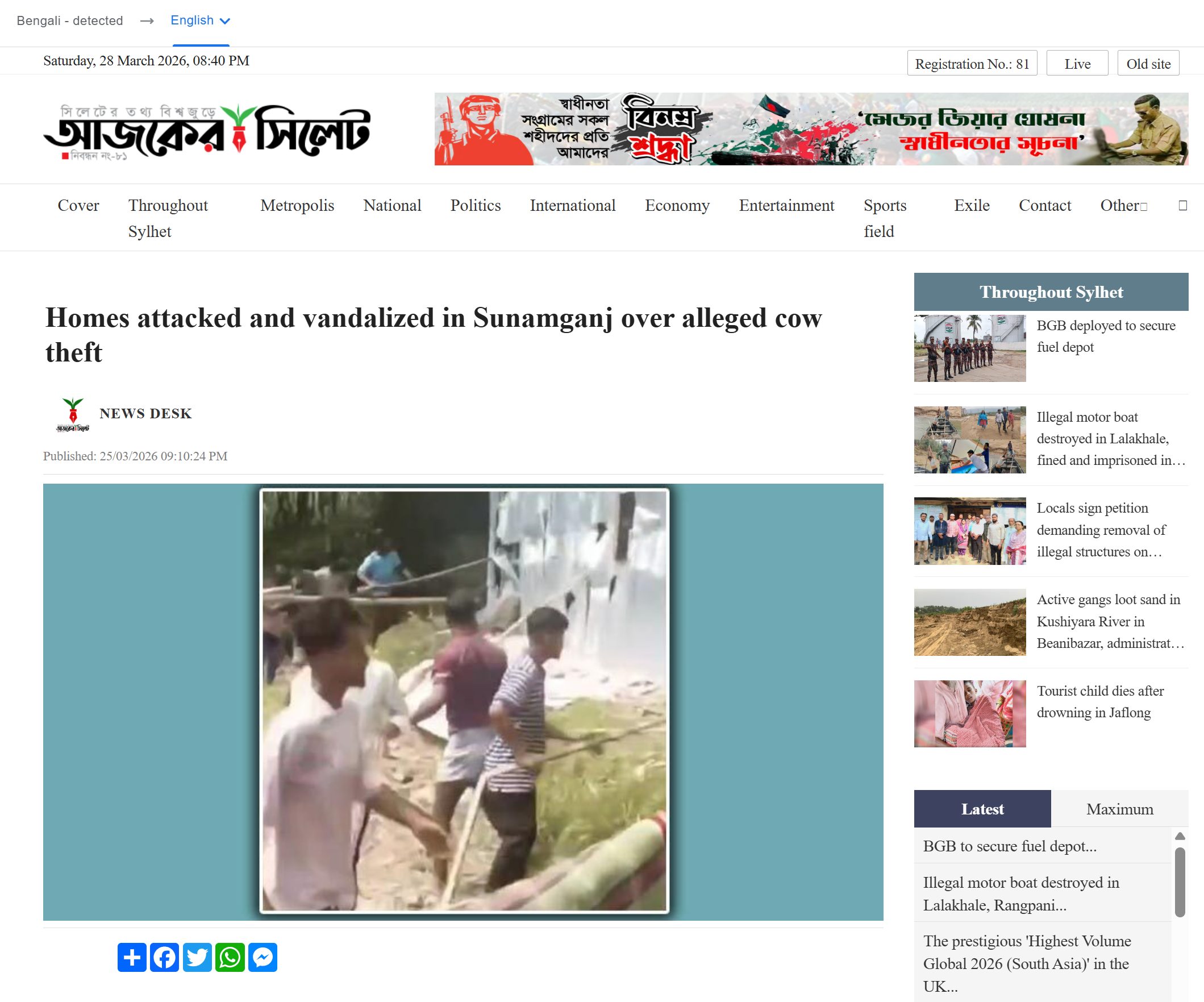 इसी प्रकार हमें एक और बांग्लादेशी न्यूज़ वेबसाइट ‘अजकेर सिलहट‘ का 25 मार्च को पब्लिश्ड एक आर्टिकल मिला. इस रिपोर्ट में बताया गया है कि सुनामगंज के छताक में गाय चोरी के आरोप में भीड़ ने एक घर में तोड़फोड़ और हमला कर दिया. रिपोर्ट के मुताबिक, उत्तर कुर्शी गांव के लोगों ने सैफुर रहमान नामक युवक को चोरी करते हुए रंगे हाथ पकड़ा, जिसने पूछताछ में अली हुसैन और उसके दामाद तारेक मिया सहित चार अन्य लोगों की संलिप्तता का खुलासा किया. इसके बाद स्थानीय बाज़ार में हुई एक बैठक के बाद उत्तेजित भीड़ ने दक्षिण कुर्शी गांव स्थित आरोपियों के घरों पर हमला कर दिया और वहां जमकर तोड़फोड़ की. पुलिस के मुताबिक, आरोपी अली हुसैन और तारेक मिया के खिलाफ पहले से भी चोरी के कई मामले दर्ज हैं और इसी आक्रोश के चलते ग्रामीणों ने इस हिंसक घटना को अंज़ाम दिया.