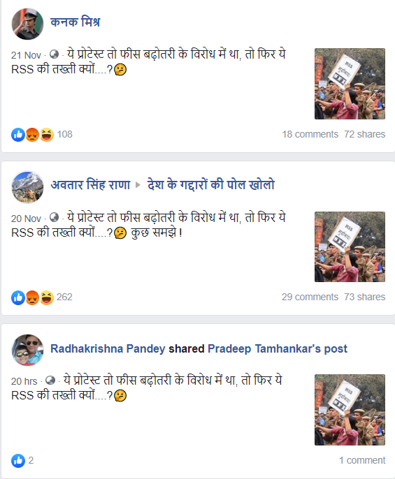 हाथ में आरएसएस विरोधी नारो वाले बोर्ड पकड़े एक महिला की तस्वीर इंडिया विथ आरएसएस ने पोस्ट किया है। ट्वीट में लिखा गया है कि, “फीस बढ़ोतरी और आरएसएस के बीच क्या संबंध है?” किसी एक विचारधारा के तहत राजनितिक रूप से प्रेरित अभियान।” -(अनुवाद) कई यूज़र्स ने इसे पोस्ट करते हुए लिखा है, “ये प्रोटेस्ट तो फीस बढ़ोतरी के विरोध में था, तो फिर ये RSS की तख्ती क्यों…?