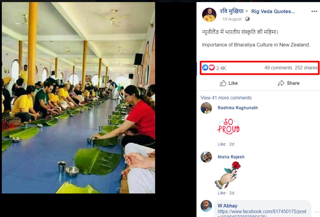 खाना खाने बैठे लोगों की एक तस्वीर सोशल मीडिया पर न्यूज़ीलैंड की बताते हुए शेयर हो रही है. बैठे हुए लोगों के सामने केले के पत्ते रखे हुए हैं. लोग दावा कर रहे हैं कि न्यूज़ीलैंड में भारतीय संस्कृति की महिमा छाई हुई है. फ़ेसबुक यूज़र रवि मुखिया ने ये तस्वीर फ़ेसबुक ग्रुप ‘Bharat Land of Gods’ और ‘Rig Veda Quotes…’ में 19 अगस्त को शेयर की. यूज़र ने दोनों ही ग्रुप में इस तस्वीर को न्यूज़ीलैंड की बताते हुए पोस्ट किया है. आर्टिकल लिखे जाने तक दोनों ग्रुप की पोस्ट को क्रमशः 2,700 और 2,400 बार लाइक किया गया है.