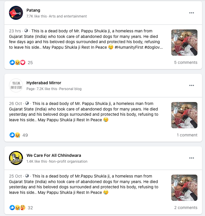 ट्विटर और फे़सबुक पर एक तस्वीर वायरल है जिसमें एक आदमी कुत्तों से घिरा हुआ है. इसके साथ कैप्शन, “ये गुजरात (भारत) के एक बेघर व्यक्ति, मिस्टर पप्पू शुक्ला जी का शव है, जो कई सालों से बेघर कुत्तों का खयाल रख रहे थे. कल उनकी मृत्यु हो गयी और उनके प्यारे कुत्ते उनके शरीर को घेरकर उसकी सुरक्षा कर रहे थे और वहां से नहीं हट रहे थे…पप्पू शुक्ला जी की आत्मा को शक्ति मिले.”