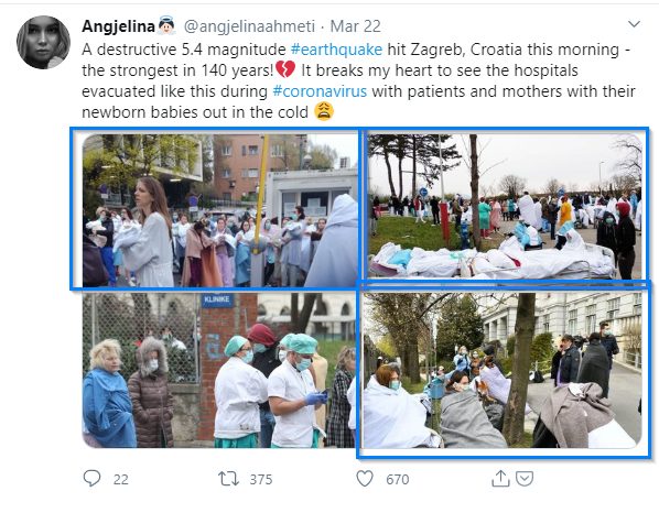 ये तस्वीर 22 मार्च 2020 को बॉस्निया के पत्रकार मिरनेस कोवाक ने शेयर की थी. तस्वीर में मरीज़ों के स्ट्रेचर को बाहर खड़े हुए देखा जा सकता है. उन्होंने ट्वीट करते हुए लिखा -“Heartbreaking photos of mothers with their newborns :baby: waiting outside in the cold during the #earthquake this morning in #Zagreb #Croatia.(अनुवाद – नवजात बच्चों के साथ माताओं की दिल दहला देने वाली तस्वीरें: आज सुबह आए भूकंप के बाद इतनी ठंड में बाहर इंतजार करते हुए. #Zagreb #Croatia.)”