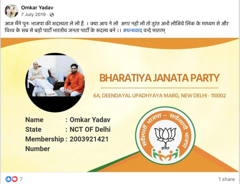 ओमकार यादव ने जुलाई 2019 में फेसबुक पर एक फोटो शेयर करते हुए भाजपा की पुनः सदस्यता लेने जानकारी भी शेयर की थी.