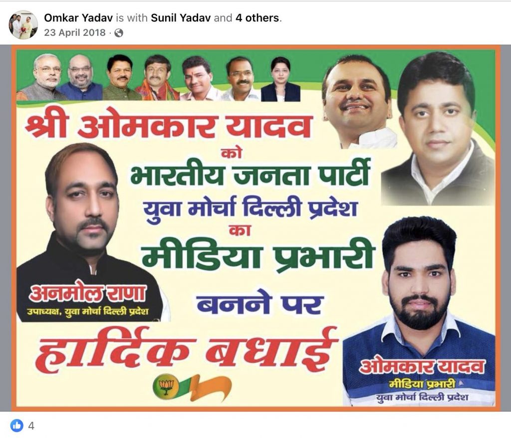अप्रैल 2018 को एक और पोस्टर में ओमकर यादव को भाजपा युवा मोर्चा के दिल्ली प्रदेश का मीडिया प्रभारी बनाये जाने की बधाई दी जा रही है.