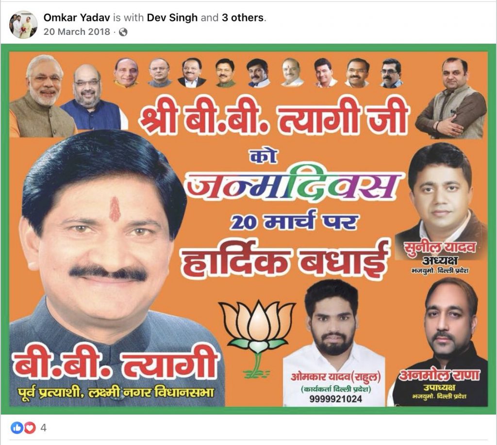 फेसबुक के टाइमलाइन पर मार्च 2018 में पोस्ट एक पोस्टर में ओमकर यादव को दिल्ली प्रदेश भाजपा कार्यकर्ता बताया गया है.