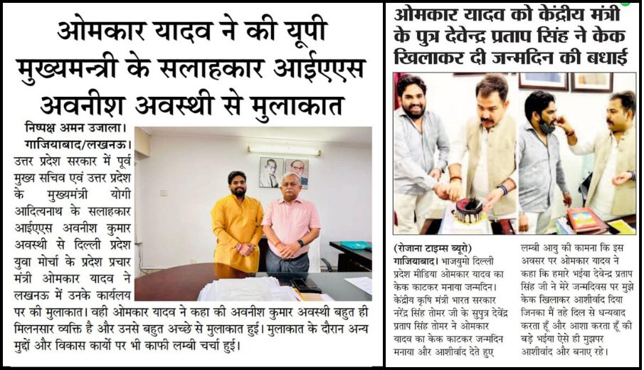 इतना ही नहीं कई मौक़ों पर नेताओं से मुलाक़ात वाली ख़बरों और अखबारों के कट्स में ओमकार यादव को भाजपा युवा मोर्चा के दिल्ली प्रदेश का मीडिया प्रभारी बताया गया है.