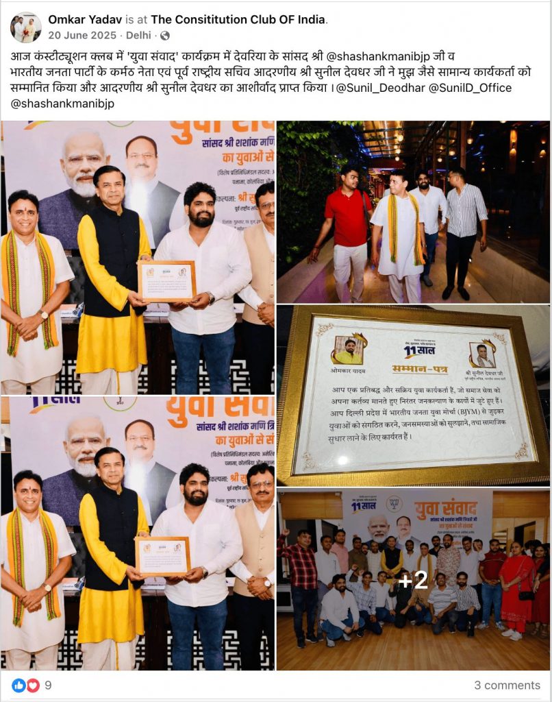 फेसबुक टाइमलाइन के एक पोस्ट में कंस्टीट्यूशन क्लब में आयोजित युवा संवाद कार्यक्रम में देवरिया के सांसद शशांक मणि और भारतीय जनता पार्टी के पूर्व राष्ट्रीय सचिव सुनील देवधर ओमकार यादव को भाजपा युवा मोर्चा कार्यकर्ता के रूप सम्मानित कर रहे हैं.