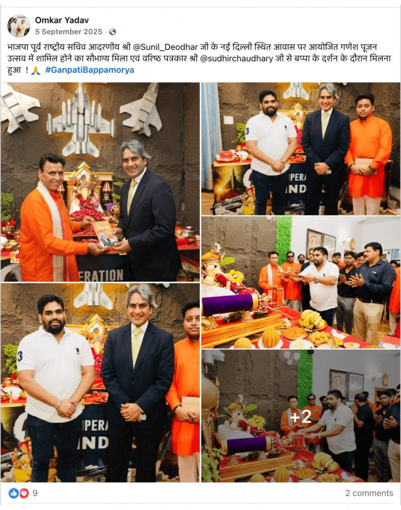 ओमकार यादव ने भाजपा पूर्व राष्ट्रीय सचिव सुनील देवधर के नई दिल्ली स्थित आवास पर आयोजित गणेश पूजन उत्सव में शामिल होने की तस्वीरें शेयर की हैं. इस कार्यक्रम में वरिष्ठ पत्रकार सुधीर चौधरी भी शामिल थे.