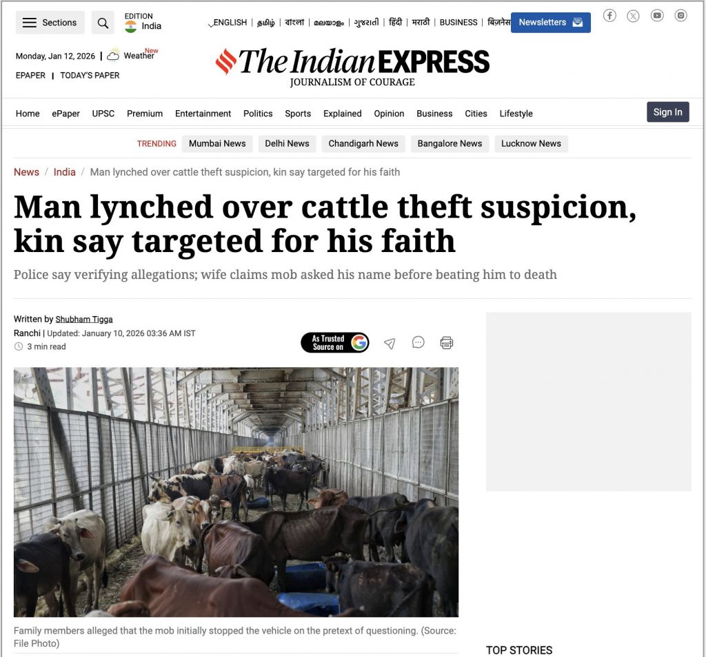 नए साल की शुरुआत कई लोगों के लिए तबाही लेकर आया जब नफ़रत आधारित भीड़ हिंसा (हेट क्राइम) ने उनकी ज़िंदगी पूरी तरह से बदल दी. 1 जनवरी से 10 जनवरी 2026 के बीच राजस्थान, मध्य प्रदेश, उत्तर प्रदेश और छत्तीसगढ़ जैसे अलग अलग राज्यों से ऐसी कई घटनाएं सामने आईं जिनमें अल्पसंख्यकों, बुज़ुर्गों और गरीब तबकों को निशाना बनाया गया. इन घटनाओं के मामलों में कहीं गोमांस के शक में पिटाई हुई, तो कहीं ‘धर्म परिवर्तन’ का आरोप लगाकर प्रार्थना सभाओं में हस्तक्षेप किया गया.