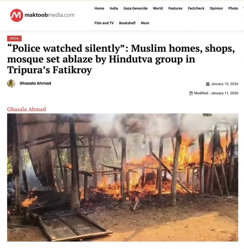 10 जनवरी की सुबह त्रिपुरा के फटिकरॉय क्षेत्र में हिंदुत्ववादी समूहों ने मुस्लिम परिवारों के साथ मार पीट की. उनके घरों, दुकानों और एक मस्जिद में तोड़फोड़ कर आग और हिंसा की गई.