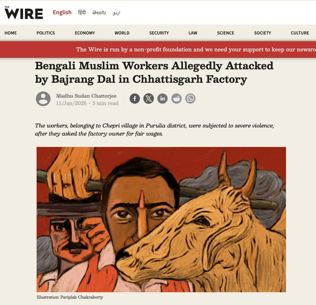“द वायर” की एक रिपोर्ट के अनुसार, 4 जनवरी को छत्तीसगढ़ के सूरजपुर ज़िले के पात्रापारा क्षेत्र में स्थित जयदुर्गा बेकरी में आठ बंगाली-भाषी मुस्लिम प्रवासी मजदूरों पीटा गया. बेकरी मालिक के साथ हुए उचित मजदूरी की मांग पर विवाद के बाद कथित रूप से बजरंग दल के कुछ कार्यकर्ताओं ने बेरहमी से इन्हें पीटा और बेकरी से बाहर निकाल दिया.