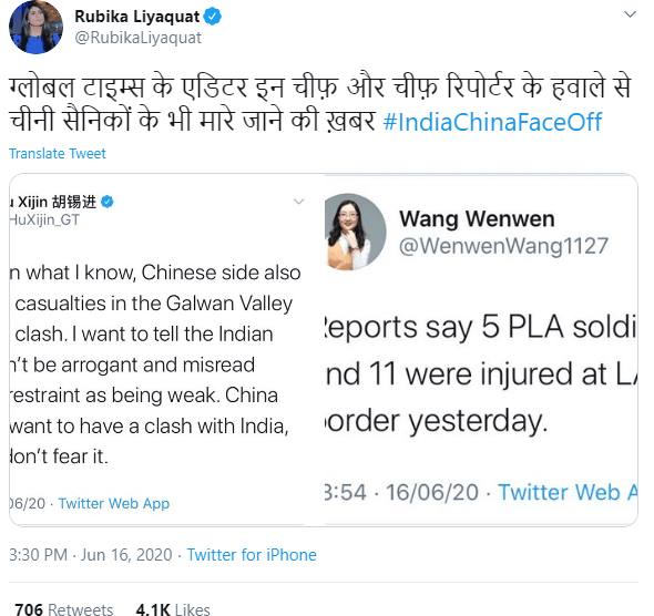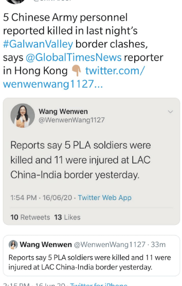 हकीकत में, ग्लोबल टाइम्स की रिपोर्टर वांग विनवेन ने ट्वीट कर पीपल लिबरैशन पार्टी के 5 सैनिकों और 11 लोगों के हताहत होने की खबर शेयर की थी.