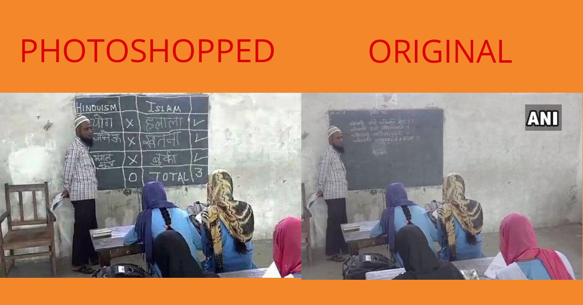 एक अन्य पोस्ट में, एक फ़ोटोशॉप तस्वीर खूब शेयर की गई, जिसमें मदरसे में एक शिक्षक को इस्लाम को हिंदू धर्म से बेहतर धर्म बताते हुए दिखाया गया।