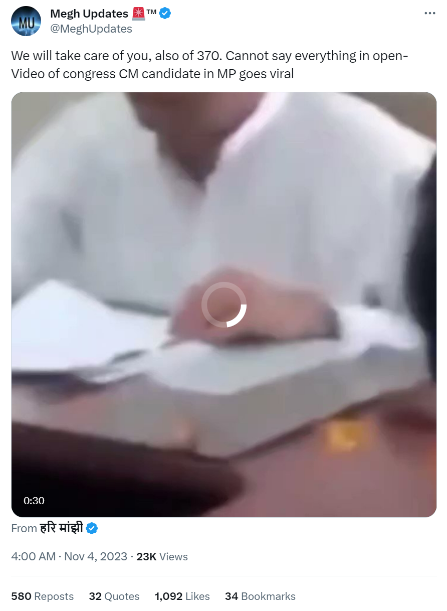 अक्सर गलत जानकारी फैलाते हुए पाए जाने वाला अकाउंट ‘मेघ अपडेट्स‘ ने वीडियो शेयर करते हुए दावा किया कि मध्य प्रदेश में कांग्रेस के मुख्यमंत्री कैंडिडेट ने कहा कि वे हर बात खुलकर नहीं कह सकते. वे मुसलमानों का भी ख्याल रखेंगे और 370 का भी. (आर्काइव लिंक)
