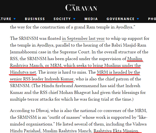 पिछले साल आरएसएस ने, अयोध्या में राम मंदिर के लिए जन समर्थन जुटाने के लिए नया सहयोगी संगठन श्री राम मंदिर निर्माण सहयोग मंच (एसआरएमएनएसएम) बनाया था। द कैरेवान (The Caravan) ने अक्टूबर 2018 में, रिपोर्ट किया था कि इस संगठन को सीधे मुस्लिम राष्ट्रीय मंच (एमआरएम) की देखरेख में रखा गया था। वरिष्ठ आरएसएस नेता इंद्रेश कुमार इन दोनों संगठनों से जुड़े हुए हैं। कैरेवान ने आगे खबर दी कि एमआरएम के राष्ट्रीय सह-संयोजक ने बताया कि “सहयोग मंच” अन्य “सम-विचारी” संगठनों द्वारा समर्थित है और इनमें से एक राष्ट्रीय एकता मिशन था।