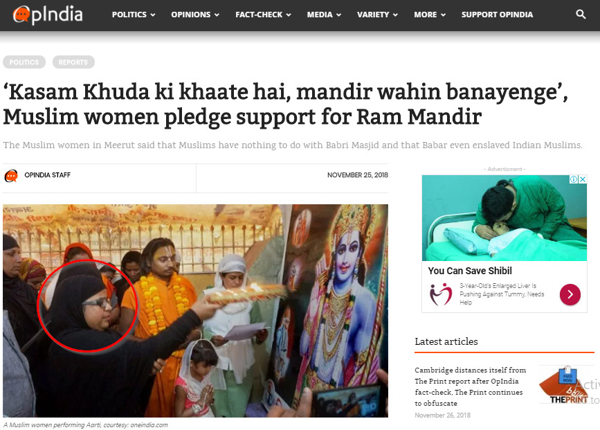 ओप इंडिया (OpIndia) भी भ्रामक रिपोर्टिंग में शामिल हो गया। “कसम खुदा की खाते है, मंदिर वहीं बनाएंगे, मुस्लिम महिलाओं ने राम मंदिर के लिए समर्थन दिया” (अनुवाद) — इस शीर्षक से अपनी रिपोर्ट के द्वारा इस संगठन ने यह धारणा दिखलाई कि अधिसंख्य मुस्लिम महिलाओं ने मंदिर के लिए समर्थन किया है। इसके अलावा, ओप इंडिया ने न केवल इसके आरएसएस कनेक्शन को छोड़ दिया, बल्कि संगठन द्वारा उपयोग की गई तस्वीर भी वाराणसी स्थित आरएसएस के एक छुपे संगठन मुस्लिम महिला फाउंडेशन (एमएमएफ) की नेता नाज़नीन अंसारी की थी। ऑल्ट न्यूज ने पहले के एक लेख में एमएफएफ के बारे में बताया था।