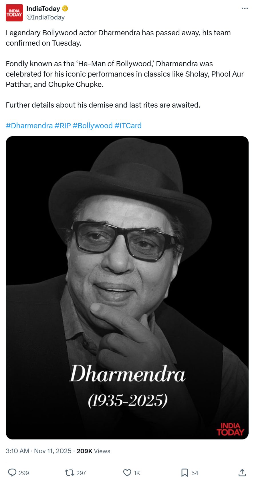 इंडिया टुडे ने खबर दी कि बॉलीवुड अभिनेता धर्मेंद्र का निधन हो गया है और दावा किया कि उनकी टीम ने इस खबर की पुष्टि की है. बाद में इंडिया टुडे ने ये पोस्ट डिलीट कर दिया. (आर्काइव लिंक)