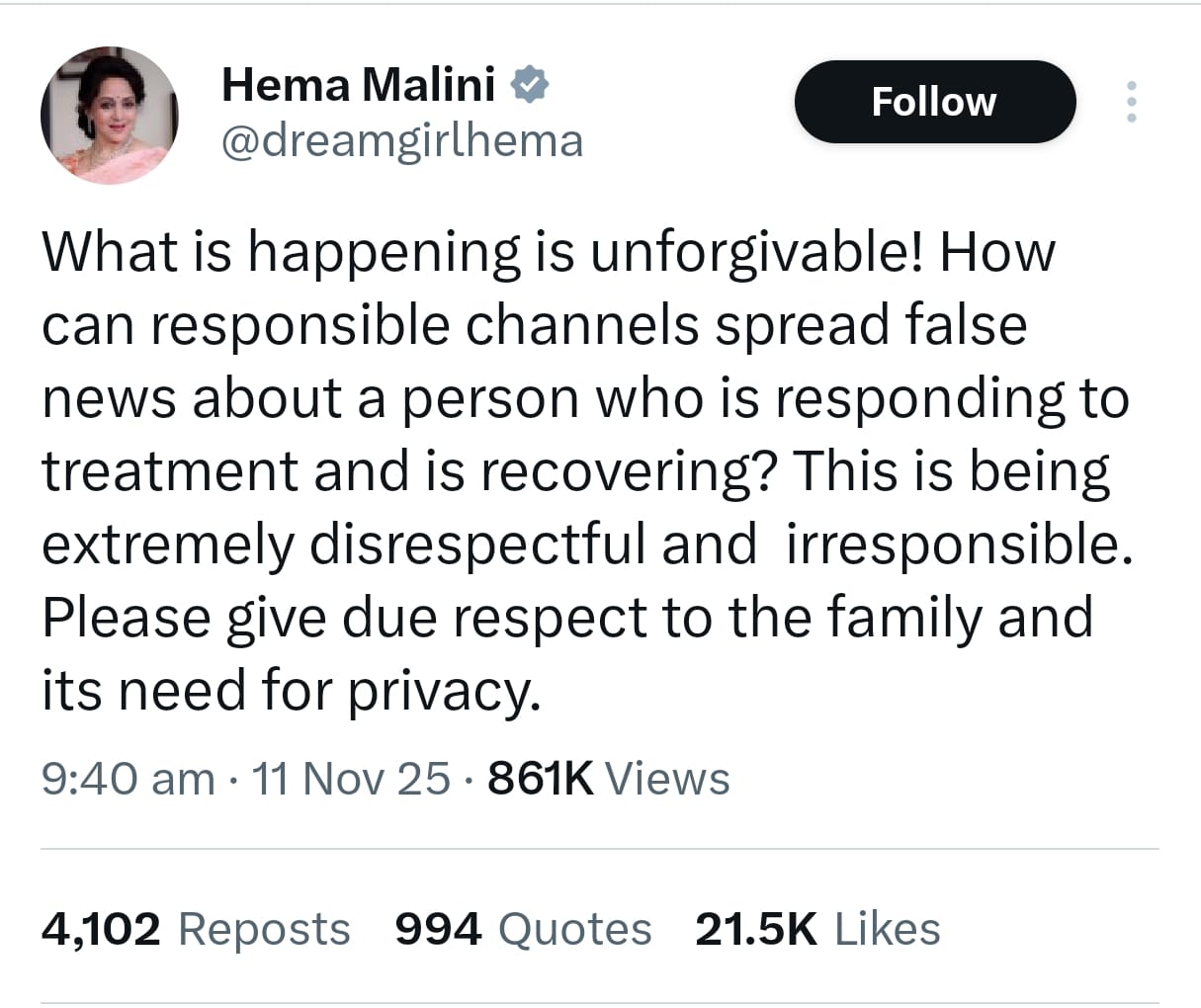 अभिनेता धर्मेंद्र के परिवार ने इन खबरों का खंडन करते हुए इस खबर को अफवाह बताया. धर्मेंद्र की पत्नी और भाजपा सांसद हेमा मालिनी ने 11 नवंबर की सुबह 9 बजकर 40 मिनट पर अपने X अकाउंट पर धर्मेंद्र के निधन की खबर पर निराशा व्यक्त की. इस खबर को फैलाने वाले चैनलों को गैर-ज़िम्मेदार बताया. उन्होंने कहा, “ज़िम्मेदार चैनल एक ऐसे व्यक्ति के बारे में झूठी खबर कैसे फैला सकते हैं जो ठीक हो रहा है?”