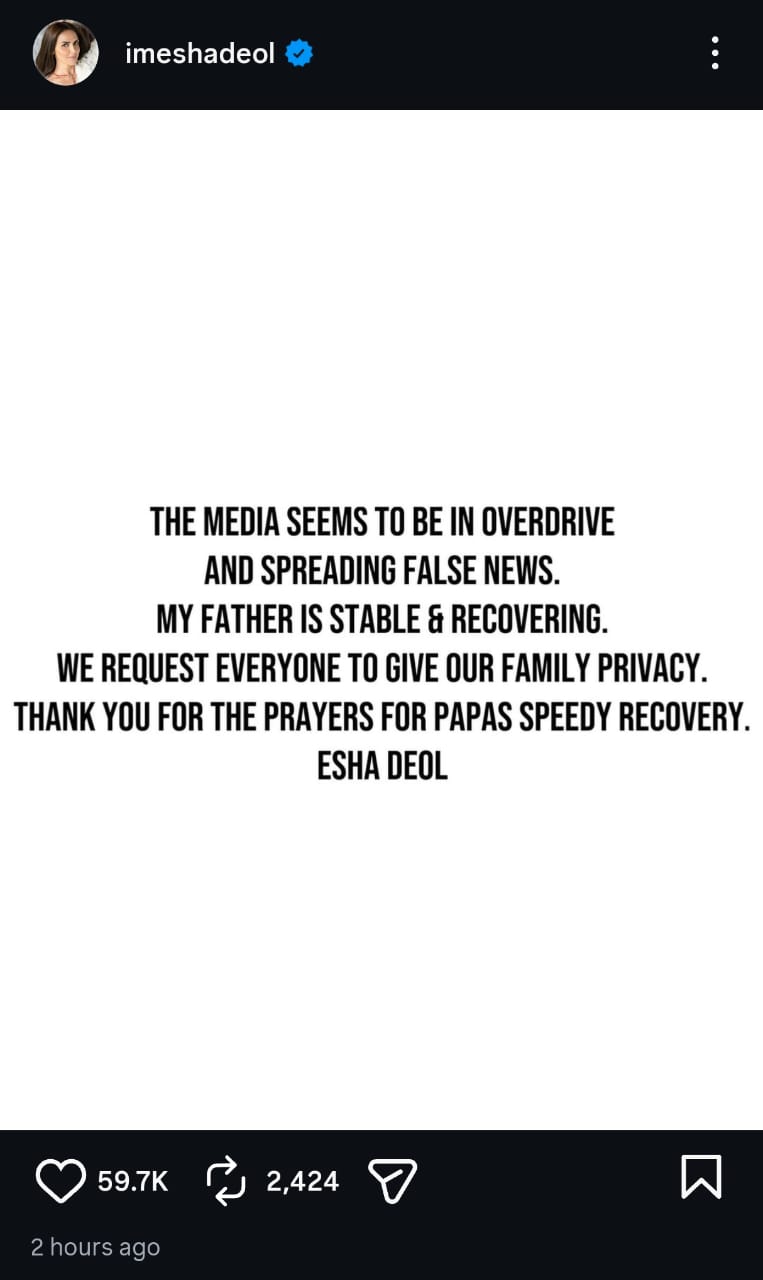 अभिनेता धर्मेंद्र की बेटी ईशा देओल ने भी अपने इंस्टाग्राम अकाउंट पर पोस्ट करके पुष्टि की कि उनके निधन की खबर पूरी तरह से झूठी है. उन्होंने ज़ोर देकर कहा कि उनके पिता की हालत स्थिर है और वह ठीक हो रहे हैं.