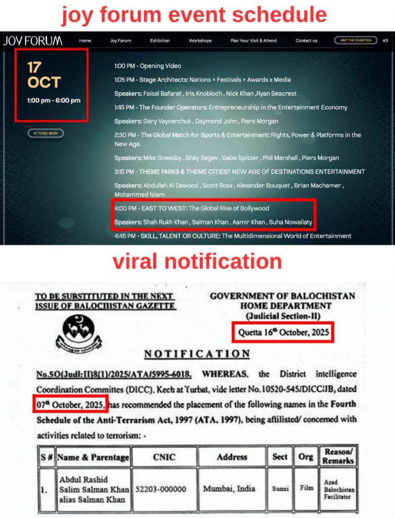 ऑल्ट न्यूज़ ने पाया कि वायरल पत्र और सलमान खान के बयान वाले कार्यक्रम के दिन में अंतर है. दरअसल, सऊदी अरब के रियाद शहर में जॉय फ़ॉरम द्वारा आयोजित दो दिवसीय कार्यक्रम में सलमान खान ने अपना बयान 17 अक्टूबर 2025 को दिया था, जबकि वायरल पत्र में दिनांक 07 अक्टूबर, 2025 के तहत, आतंकवाद से संबंधित गतिविधियों में शामिल/संबंधित होने के कारण, आतंकवाद विरोधी अधिनियम, 1997 (एटीए, 1997) की चौथी अनुसूची में निम्नलिखित नामों को शामिल करने की सिफारिश की है. और वायरल पत्र 16 अक्टूबर, 2025 का है.