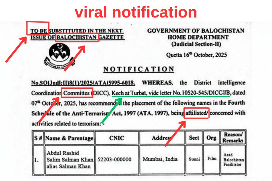 इसी संदर्भ में भाजपा समर्थक मोनिका वर्मा ने बलूचिस्तान सरकार के गृह विभाग के नोटिफिकेशन जैसे दिखने वाले पत्र की तस्वीर शेयर करते हुए दावा किया कि पाकिस्तान ने बॉलीवुड अभिनेता सलमान खान को “आतंकवादी” घोषित कर दिया है, क्योंकि उन्होंने एक कार्यक्रम में बलूचिस्तान को एक अलग देश बताया था.