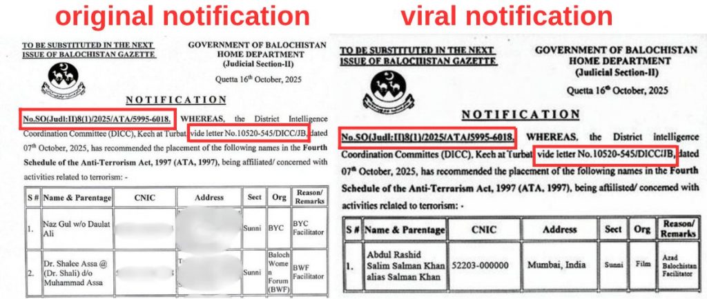 ऑल्ट न्यूज़ ने पाया कि सलमान के खिलाफ वायरल पत्र और बलूच महिला फोरम को जारी अधिसूचना पत्र में जारी अधिसूचना नंबर No.SO(Judl:II)8(1)/2025/ΑΤΑ/5995-6018. और लेटर नंबर 10520-545/DICC/JB. दोनों के समान हैं. इसे देखने पर मालूम पड़ता है कि 16 अक्टूबर को जारी इसी अधिसूचना पत्र को एडिट कर सलमान वायरल पत्र को बनाया गया है.