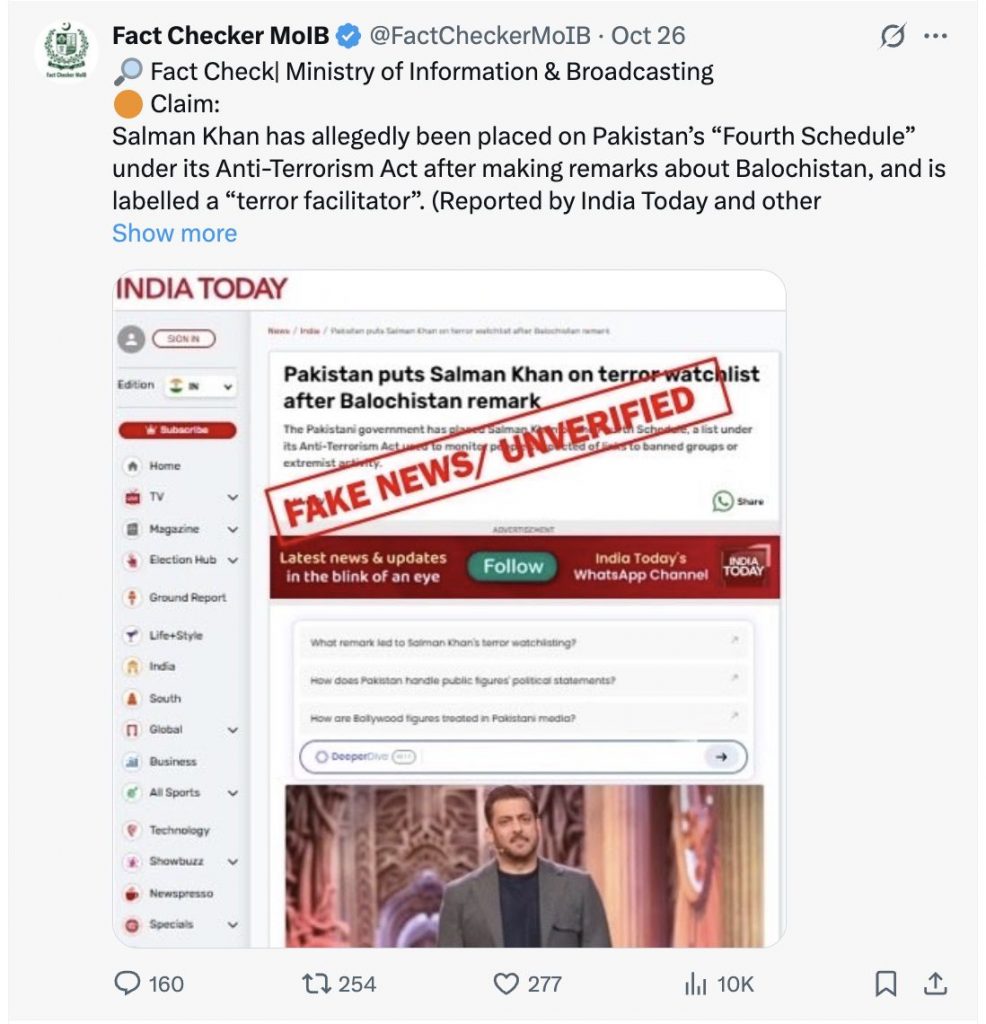 जांच के दौरान हमें पाकिस्तान के सूचना एवं प्रसारण मंत्रालय के फैक्ट चेक यूनिट का एक पोस्ट भी मिला. इसमें इंडिया टुडे की रिपोर्ट इंडिया टुडे की उस रिपोर्ट का खंडन किया गया जिसमें बताया गया था कि सलमान खान को आतंकवादी घोषित कर दिया गया है.