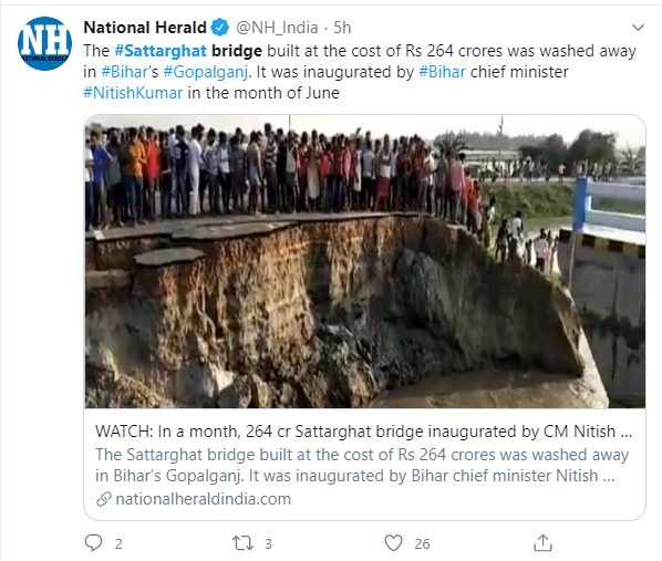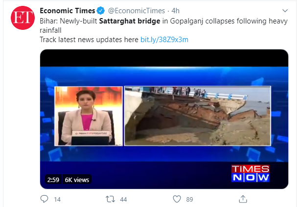 बिहार के विपक्ष के नेता तेजस्वी यादव ने मुख्यमंत्री नितीश कुमार पर निशाना साधते हुए ये वीडियो ट्वीट किया. उन्होंने लिखा, “8 वर्ष में 263.47 करोड़ की लागत से निर्मित गोपालगंज के सत्तर घाट पुल का 16 जून को नीतीश जी ने उद्घाटन किया था आज 29 दिन बाद यह पुल ध्वस्त हो गया.”