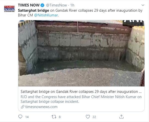 लगभग सभी मिडिया आउटलेट्स ने यही खबर दी – भारी बारिश के कारण पानी का बहाव ज़्यादा हो गया जिससे सत्तरघाट पुल का एक हिस्सा गिरकर ध्वस्त हो गया. खबर की हेडलाइन में सत्तरघाट पुल का इस्तेमाल करते हुए इस बात पर जोर दिया कि 264 करोड़ की लागत से बना ये पुल एक महीने में क्षतिग्रस्त हो गया.