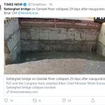 #WATCH: Portion of Sattarghat Bridge on Gandak River that was inaugurated by CM Nitish Kumar last month in Gopalganj collapsed yesterday, after water flow increased in the river due to heavy rainfall. #Bihar pic.twitter.com/cndClJHIAa